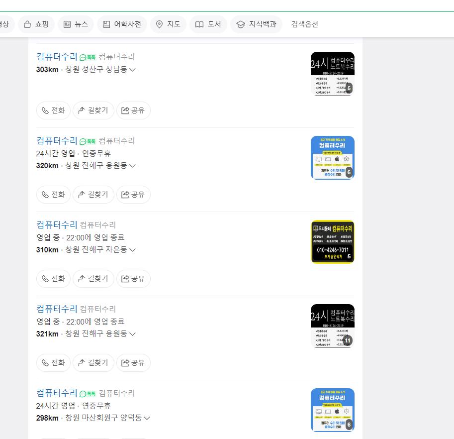 모든 업장명이 컴퓨터수리로 되어있습니다.